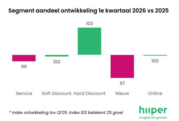Op kanaalniveau zien we beperkte verschuivingen ten opzichte van vorig jaar. Het servicekanaal verliest opnieuw licht terrein (index 99), terwijl soft discount stabiliseert. Hard discount blijft als enige segment groeien met een index van 103,5 en bevestigt daarmee de aanhoudende voorkeur van consumenten voor prijs en waarde.