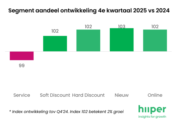 Op macroniveau zijn de bewegingen minder uitgesproken dan voorgaande kwartalen. Vergeleken met vorig jaar verliest het servicekanaal licht terrein (index 99). Discount groeit nog altijd (index 102), maar wel minder hard dan eerder dit jaar. Nieuwere formules (index 103) en online spelers (index 102) laten een vergelijkbaar gematigd beeld zien. De trend richting value-gedreven boodschappen blijft daarmee wel duidelijk intact.