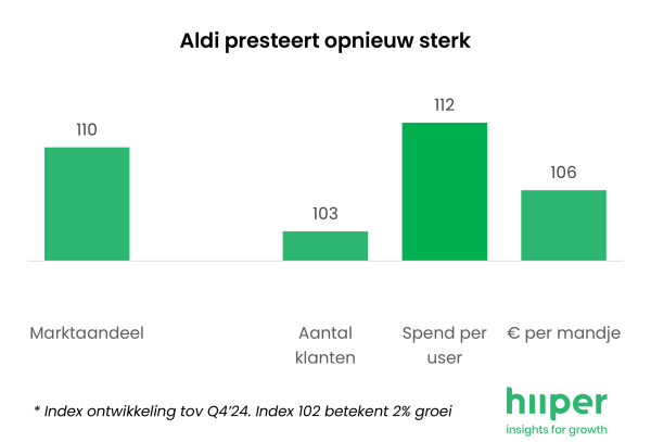 De sterkste structurele winnaar blijft Aldi, dat nog altijd stevig groeit in marktaandeel (index 109). De formule weet zowel meer klanten (+3%) als hogere besteding per transactie (+6%) te realiseren. De groei vlakt wel af: vergeleken met vorige kwartalen zien we een lichte daling in de marktaandeelontwikkeling. Ook Picnic laat een krachtig kwartaal zien, met een marktaandeel index 113, voornamelijk gedreven door +14% klanten.