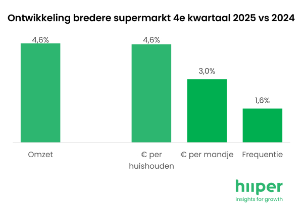 Joep Smeets, Managing Director van Hiiper, concludeert: “De waarde die consumenten hechten aan prijs/waarde blijft bepalend, ook in het vierde kwartaal. De aanhoudende inflatie drijft enerzijds de omzet omhoog, maar maakt dat consumenten andere keuzes blijven maken. Dat discount en value-formules daarbij winnen, past in een bredere trend die al twee jaar zichtbaar is. Interessant is dat dit thema nu ook rond de feestdagen doorzet. Of dit ook komend kwartaal doorzet valt natuurlijk te bezien. Maar zeker is dat de concurrentie toeneemt, gelet ook op het recente prijs offensief van Lidl. We blijven het op de voet volgen.”